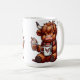 Charmante Abbildung einer flauschigen Highland-Kuh, gebündelt in einem karierten Schal, in dem heiße Getränke gereicht werden. Perfekte Darstellung von Komfort und Wärme.
