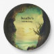 Papier Teller mit einem Bild eines Ozeanparadieses. Eine felsige Höhle, die in den Bergen aufsteigt und einen wunderschönen Ozean überragt, mit Vögeln, die zusammen fliegen.