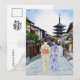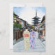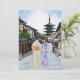 Diese Postkarte zeigt ein Aquarellportrait von zwei Frauen in Kimonos, die die Straße vor dem Hōkan-Ji Tempel in Kyoto entlang gehen.