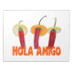 Hola Amigo. Drei Paprikaschoten mit heißem Chili, drei Amigos in Sombreros. Text Hola Amigo. Hübsche Drucke, Geschenke und Shirts für Spaß und gute Laune.