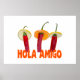 Hola Amigo. Drei Paprikaschoten mit heißem Chili, drei Amigos in Sombreros. Text Hola Amigo. Hübsche Drucke, Geschenke und Shirts für Spaß und gute Laune.