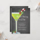 Moderne Brautdusche mit rotem Martini-Glas mit Heiligem und einem Set mit Süßkarpfen auf einem beliebten und trendigen Chalkboard-Hintergrund. Stilvoller Polterabend lädt zum Winterurlaub, zu Weihnachten und zum Brautparty der Ferien ein.