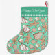 Dieser hübsche Weihnachtsbaum weist ein weihnachtliches Keksmuster auf, wie einen Holiday-Baum, einen Lebkuchenmann, einen Stern und Baumbulben. Die Bilder werden auf einem minzgrünen Hintergrund platziert. Oben auf dem Strumpf befindet sich ein dunkler aquamariner Rahmen mit einem Diamantformrahmen in weiß, und ein weißes Drehbuch, das "Frohe Weihnachten" sagt. Die Rückseite des Strumpfs ist identisch mit der Vorderseite, mit Ausnahme eines zweiten Textfelds, das Sie anpassen können. Derzeit steht dort "Happy New Year".