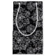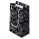 Diese Weihnachtsgeschenktasche ist in einem Schwarz-Weiß-Schneeflocken-Printdesign ausgestellt. Passen Sie dieses Objekt an oder kaufen Sie, wie es ist. Stock Image freepik.com all-free-download.com