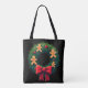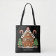 Cute, fun festive holiday tote bag for women, with a colorful gingerbread house, designed with candy canes and Christmas trees on one side and a gingerbread wreath on the other. Great for toting things or gifting to friends or family for the holidays.