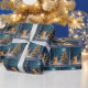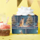 Ein Hund sitzt neben einem schneebedeckten Weihnachtsbaum, der mit Lichtern und Ziergegenständen geschmückt ist und sich in einer ruhigen, schneebedeckten Nacht in einem Glanz erklingt