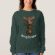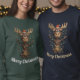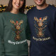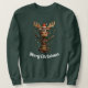 This funny and cute 3D illustration depicts a bewildered-looking moose in a festive mood, wearing a tiny Santa hat. The moose's entire body is covered in strands of colorful Christmas lights wrapped around its large antlers and body. This illustration is perfect for quirky Christmas sweaters, holiday stickers, novelty apparel, or as gifts for nature and wildlife lovers with a sense of humor.