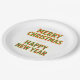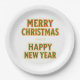 Fun festive paper plates with "Merry Christmas and a Happy New Year "on it. Lettering in a cheery red and green geometric pattern outlined in gold. Great for holiday parties when getting together with family, friends or co-workers.