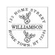 Ein kreisförmiges, personalisiertes Selbstfarben-Design mit Rudolph über und unter Ihrem Familiennamen und umgeben von Ihren Adressdaten. Ideal, um eine zusätzliche handgestempelte Touch zu Ihren Urlaubskarten hinzuzufügen.