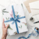 Ein Aquarellmuster aus Fichten- und Kiefernästen mit Kegeln, roten Beeren und Wintergrün auf diesem klassischen Weihnachtswulstpapier auf schlichtem weißem Hintergrund.