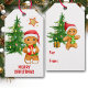 Ein bezaubernder kleiner Lebkuchenmann trägt eine rote Weihnachtsmannmütze und trägt leicht eingewickelte Geschenkpackungen an der Vorderseite dieses Geschenketiketts. Ein goldener Stern liegt über dem Lebkuchenmann, und hinter ihm steht ein verzierter Weihnachtsbaum. Ihr benutzerdefinierter Text ist unten. Es gibt noch ein Bild des Lebkuchenmanns auf der Rückseite des Tags, mit dem eigenen Text unten. Niedlich für Kinder jeden Alters!