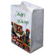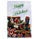 Mittlere glänzende Geschenktasche mit Vintagem, beidseitigem Bild aus den 40er Jahren eines schwarzen Zuges mit Pfefferminzkerzenrädern, mit Heiligenverzierung verziert und mit Weihnachtsgeschenken auf Schneefall gefüllt. Ein angehängtes Tag lautet "Beste Wünsche". "Happy Holidays" steht oben im grünen Skript. Siehe dazu passende große Geschenktüte, Grußkarte, Puzzle Gruß, Gefälligkeitskiste, Gefälligkeitstafel, Etikett, viereckiger Aufkleber, individuell zugeschnittenes Vinyl-Aufkleber und Packpapier. Siehe die gesamte Holiday Gift Bag Kollektion in den SPEZIELLEN TOUCHS | Abschnitt Gastgeschenke.
