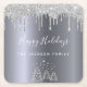 Falsch silver metallic looking background with falsch silver glitter drip, a bit of bling and luxury for Christmas. A winter forest trees as decoration. With the text: Happy Holidays. Template for Your family name, white letters.