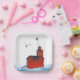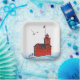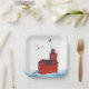 Grosser roter Leuchtturm mit Wellenspritze und Seagull auf weißem Hintergrund.