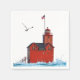 Grosser roter Leuchtturm mit Wellenspritze und Seagull auf weißem Hintergrund.