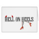 Phrase, "Hölle auf Heels" im schwarzen u. weißen modernen WeltSchriftart mit Hörnern des roten Teufels über dem Wort, "Hölle," und die Beine einer Frau, die rote Schuhe der hohen Ferse unter das Wort, "Heels tragen."