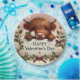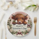 Eine bezaubernde Abbildung einer flauschigen Hochlandkuh, umgeben von weißen Rosen, Herzen und Bögen, die eine Valentinstag-Botschaft hält und Gefühle von Liebe, Zuneigung und Feiern in einem skurrilen Design weckt.