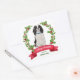 Auf diesen Holiday Korrespondenzaufklebern ist ein Porträt eines schwarz-weißen Cavalier King Charles Spaniel Hundes umgeben von einem roten Beerenholzkranz. Am unteren Rand ist ein rotes Banner mit Ihrem individuellen Weihnachtsgrüßen, und Ihre Unterschrift ist grün darunter.