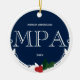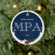 Ein Ornament für einen MPA-Absolventen mit einem blau-weißen Farbschema und einer Heiligbeere und Blattdekoration. Es zeigt den Grad, den Namen und das Jahr. Einfach anpassen Sie dieses Ornament, fügen Sie es in Ihren Warenkorb, und haben Sie einen Vorzug dieser großen Leistung. Holly Berry Blue White MPA Abschluss Name Jahr Keramik Ornament Holidaday Design | ©Melissa Patton - Designer