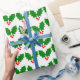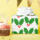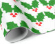 Dieses Verpackungspapier hat ein Weihnachtsdesign aus heiligen Blätter und Beeren, die auf einem weißen Feld verstreut sind.