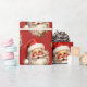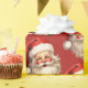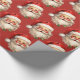 Umschlagpapier mit einer fröhlichen Illustration eines Vintagen Stil Weihnachtsmann mit roten rosa Wangen. Tragen Sie seine klassische rote Weihnachtsmannmütze und seinen großen weißen Bart. Der heilige Geist dieses Designs wird durch einen Hauch von Heiligenschein unterstrichen.