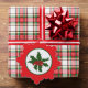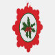 red scalloped ornament with holly leaves and berries in a white circle, hanging from a ribbon on a festive tree