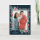 Elegante Urlaubskarte mit Ihrem bevorzugten Foto auf der Vorderseite gerahmt von roten Wasserfarben, Heiligbeeren mit grünen Kiefernbäumen und Blättern vor einem marinen Hintergrund. "Frohe Weihnachten" wird oben in einem eleganten weißen Kalligraphieskript angezeigt. Personalisieren Sie die Vorderseite der botanischen Urlaubskarte, indem Sie Ihren Namen und das Jahr hinzufügen. Die Innenseite der gefalteten Ferienkarte Ihre individuelle Nachricht im Seetext. Auf der Rückseite der Karte befindet sich ein zusätzliches Foto. Entworfen, um sich mit unserer Ferienkollektion von Holly und Evergreen abzustimmen.