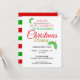 Hallo und willkommen. Ein festliches, lustiges Design für Weihnachten. Eine Einladung für ein Weihnachtsessen mit roten und grünen Streifen mit Standard-Text, der leicht angepasst werden kann.