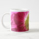 Diese phantastische Tasse zeigt ein nahes Foto einer tiefrosa Hollyhock-Blume. Das Foto wurde mit Makrofotografie aufgenommen, was zu einem sehr detaillierten Bild führte.