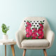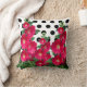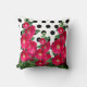 Kopfkissen mit dem Bild von weinfarbenen Hollyhocks vor einem Hintergrund von schwarz-weißen Polka Punkten.