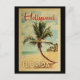 Ein einzigartig Retro Mitte des Jahrhunderts moderne Hollywood Florida Kunstdruck in Vintage Reise Poster Stil. Es verfügt über eine geschwungene Palme am Sandstrand mit Ozean unter einem blauen bewölkten Himmel.