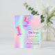Eine mädchenhafte und weibliche Quinceañera Party Einladung. Ein Regenbogen, holografisch gefärbter Hintergrund in lila, pink, mint grün, Rose gold. Personalisieren und fügen Sie einen Namen und Party-Details hinzu. Der Name wird mit einem handgeschriebenen Stilskript geschrieben, lila Buchstaben. Nummer 15 wird mit einem Schriftart im Ballonstil geschrieben, Skript. 1 Blatt = 1 Einladung mit Druckkante bis Kante.
