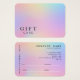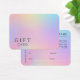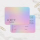 Die Holographic Gradient Gift Card in sanften Rosatönen verleiht dem Design eine feminine und elegante Touch. Diese Karte ist perfekt für T - Shirt, Boutiquen oder Mode-Online-Shops geeignet und ist vollständig mit Ihren Geschäftsdetails anpassbar. Ob Wimpernverlängerungen, Kosmetikdienstleistungen, Make-up Artists, Haarstylisten oder Nagelfeile - diese Geschenkkarte ist ein ideales Instrument zur Stärkung Ihrer Markenpositionierung. Dieses Geschenkgutschein, das für besondere Anlass oder verwöhnende Leckereien konzipiert ist, bietet Schönheitsliebhabern ein angenehmes Erlebnis, während Sie Ihre Markenidentität stärken und Ihre Marktpräsenz verbessern.