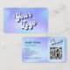 Retro QR Code Visitenkarte mit blauem und lila Gradientenhintergrund und nostalgischen Schriftart. Diese angesagten Beauty-Salon-Visitenkarten beinhalten Platz für Ihr Logo, einen scannbaren QR-Code und Kontaktdaten. Dieser groovative holografische Effekt Social Media Visitenkartendesign kann jedes Geschäft wie Make-up Studio, lash salon, Nägel Wellness-Center und mehr Anzug! Mit diesen Visitenkarten können Sie ganz einfach Ihr Instragram, Ticktok, Facebook oder andere soziale Medien fördern.