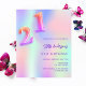 Eine mädchenhafte und weibliche Party Einladung zum 21. Geburtstag. Ein Regenbogen, holografisch gefärbter Hintergrund in lila, rosa, minzgrün. Personalisieren und fügen Sie einen Namen und Party-Details hinzu. Der Name wird mit einem handgeschriebenen Stilskript geschrieben, lila Buchstaben. Nummer 21 wird mit einem Schriftart im Ballonstil geschrieben, Skript. 1 Blatt = 1 Einladung mit Druckkante bis Kante.