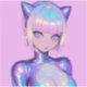 Holographic catgirl portrait in glossy cyber armor, with rainbow bob hair and luminous violet eyes. Iridescent highlights and smooth gradients bring a dreamy Y2K cyber-pop mood against a soft pink backdrop. A bold, playful look for fans of futuristic anime characters and neon color palettes.