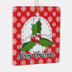 Holly auf einem rot weißen Schneeflocken Muster Hintergrund mit der Beschriftung "Frohe Weihnachten".