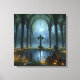 Eine Frau betet in einer mondbeleuchteten Nacht von einem alten Kreuz.