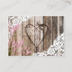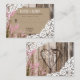 Altes Holz und weiße Spitzen mit rosa Lavendel Blume über Leinen-Look rustikale Platzkarte Design für eine Country Western Hochzeit.
