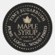 Geben Sie Ihren Firmennamen, Ihre Adresse, das Volumen des Sirup und den Ahornsirup-Grad ein. Elegantes schwarz-goldenes Etikett mit einem goldenen Ahornblatt aus Zucker.