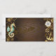 Brauner Holzboden mit Meer, mechanischer Rücken, antikes Lenkrad, goldener Anker und verschiedene Gold- und Messinggetrieben. Steampunkstil.
