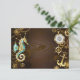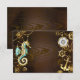 Brauner Holzboden mit Meer, mechanischer Rücken, antikes Lenkrad, goldener Anker und verschiedene Gold- und Messinggetrieben. Steampunkstil.