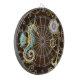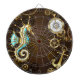 Brauner Holzboden mit Meer, mechanischer Rücken, antikes Lenkrad, goldener Anker und verschiedene Gold- und Messinggetrieben. Steampunkstil.