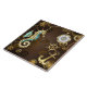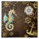 Brauner Holzboden mit Meer, mechanischer Rücken, antikes Lenkrad, goldener Anker und verschiedene Gold- und Messinggetrieben. Steampunkstil.
