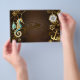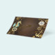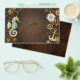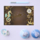 Brauner Holzboden mit Meer, mechanischer Rücken, antikes Lenkrad, goldener Anker und verschiedene Gold- und Messinggetrieben. Steampunkstil.