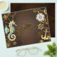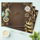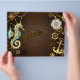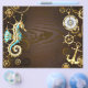 Brauner Holzboden mit Meer, mechanischer Rücken, antikes Lenkrad, goldener Anker und verschiedene Gold- und Messinggetrieben. Steampunkstil.
