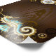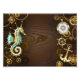 Brauner Holzboden mit Meer, mechanischer Rücken, antikes Lenkrad, goldener Anker und verschiedene Gold- und Messinggetrieben. Steampunkstil.
