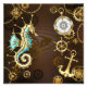 Brauner Holzboden mit Meer, mechanischer Rücken, antikes Lenkrad, goldener Anker und verschiedene Gold- und Messinggetrieben. Steampunkstil.