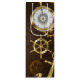 Brauner Holzboden mit Meer, mechanischer Rücken, antikes Lenkrad, goldener Anker und verschiedene Gold- und Messinggetrieben. Steampunkstil.