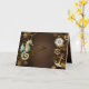Brauner Holzboden mit Meer, mechanischer Rücken, antikes Lenkrad, goldener Anker und verschiedene Gold- und Messinggetrieben. Steampunkstil.
